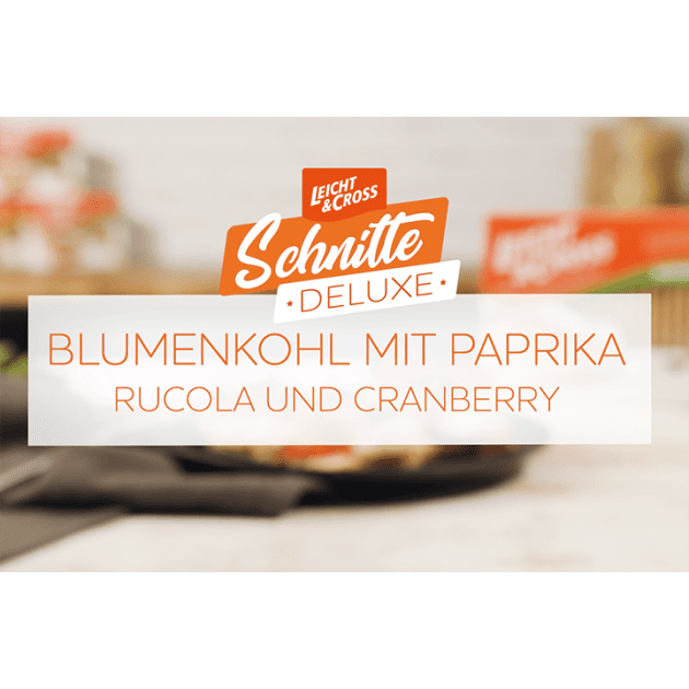 Unsere Schnitte Deluxe glänzt mit einer geballten Ladung an Gemüse. Gebratener Blumenkohl und selbstgemachtes Paprikamus werden mit Rucola und Cranberrys abgerundet. Probiert es direkt aus! Von außergewöhnlich belegten Schnitten bekommt ihr nicht genug? Dann schaut euch doch einmal unsere Schnitte Deluxe in der Variante mit Ziegenkäse und karamellisierten Birnen an!