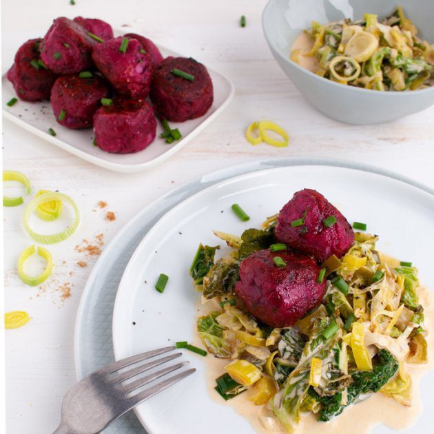 Rote Bete Knödel mit Rahm-Porree