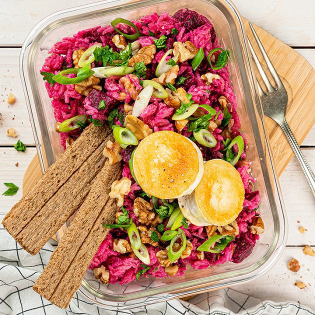 Bei uns wird es bunt in der Lunchbox – und zwar mit diesem Reissalat. Die Farbe kommt von Rote Bete Knollen, dazu gesellen sich Walnüsse, Frühlingszwiebeln und gebratener Ziegenkäse. Super lecker – probiert es unbedingt aus! Ihr sucht noch nach weiterer Meal-Prep-Inspiration? Dann probiert auch einmal unseren Bunte Bete-Karotten-Salat mit Burrata aus.