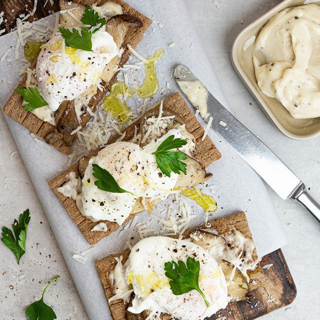 Heute wird es auf unserem Knusperbrot exquisit. Wir belegen es mit Trüffelcreme, eine Pilz-Mischung, pochiertem Ei und geriebenem Parmesan. Eine richtige Schnitte Deluxe. Probiert ihr es auch aus? Schnitte Deluxe klingt ganz nach eurem Geschmack? Dann müsst ihr unsere Schnitte Deluxe mit Roquefort, Erdnussbutter, Rotkohl, Aprikosen und Mandeln probieren!