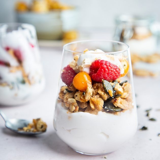 Physalis-Himbeer-Dessert mit Nuss-Crunch